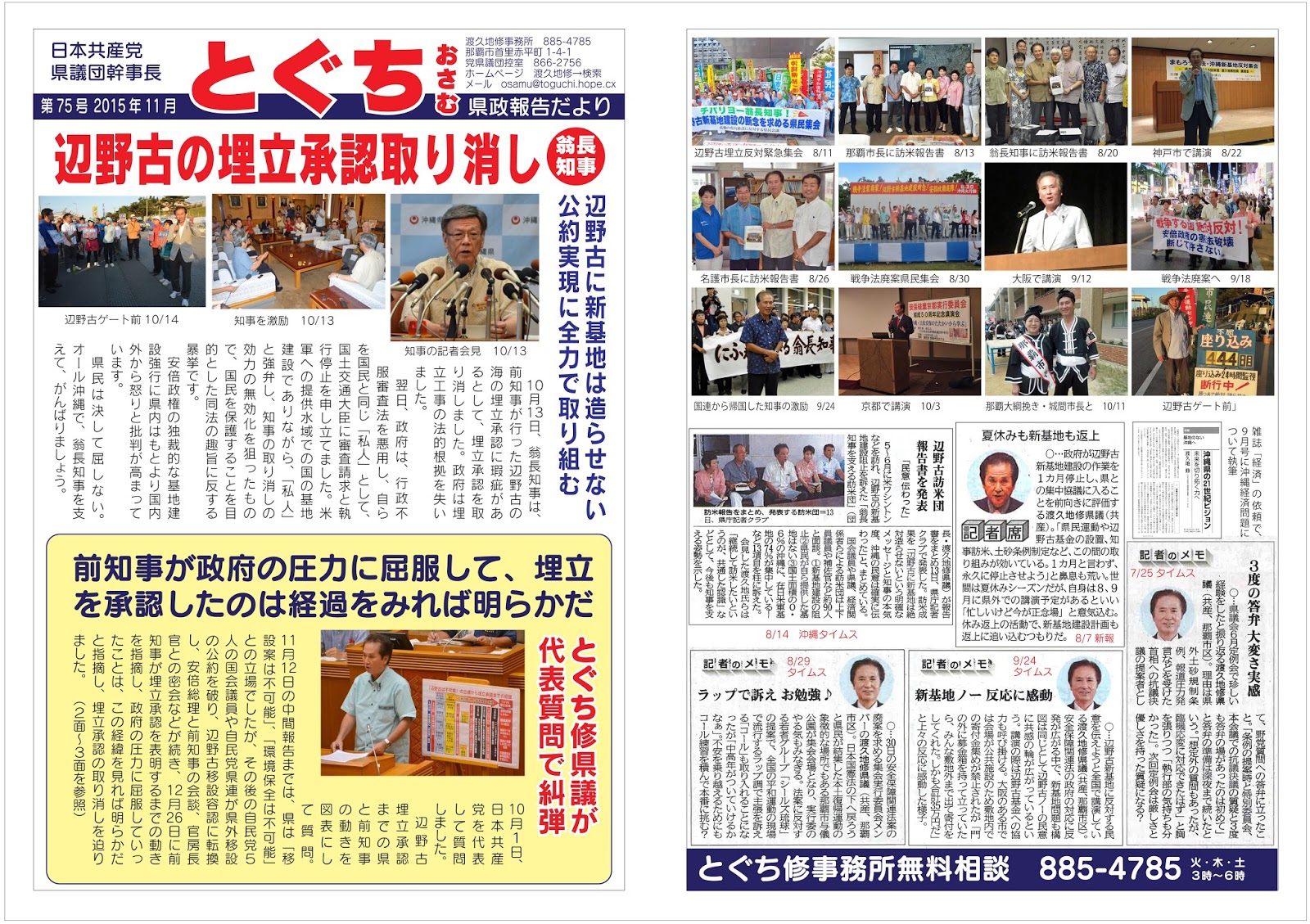 第75号 1面・4面 2~3面とぐち修県政報告だより、2015年6月議会報告